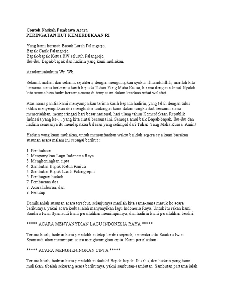 Hari ulang tahun Kemerdekaan Republik Indonesia yang ke-73 yang kita cinta bersama ini. Contoh teks pembawa acara ulang tahun anak.