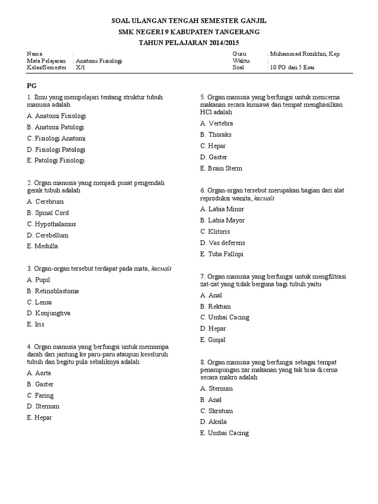 Contoh Soal Uas Anatomi Fisiologi Manusia Tahun 2016